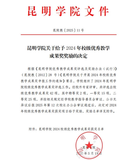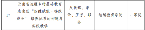 近日,昆明学院公布了2024年校级优秀教学成果奖评审结果,其中由我院吴跃辉副院长主持,教师培训部李云主任、王芳副主任、邱莎老师参与,彭艳、尹敏霞协助申报的《云南省边疆乡村基础教育班主任“四维赋能·梯级成长”培养体系的构建与实践教学》项目,荣获校级优秀教学成果一等奖。